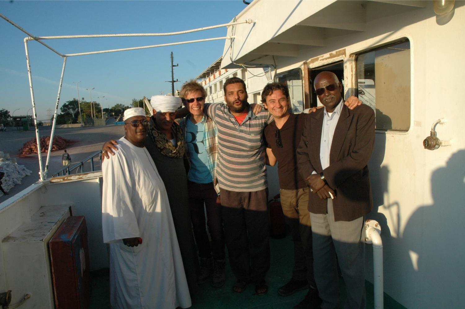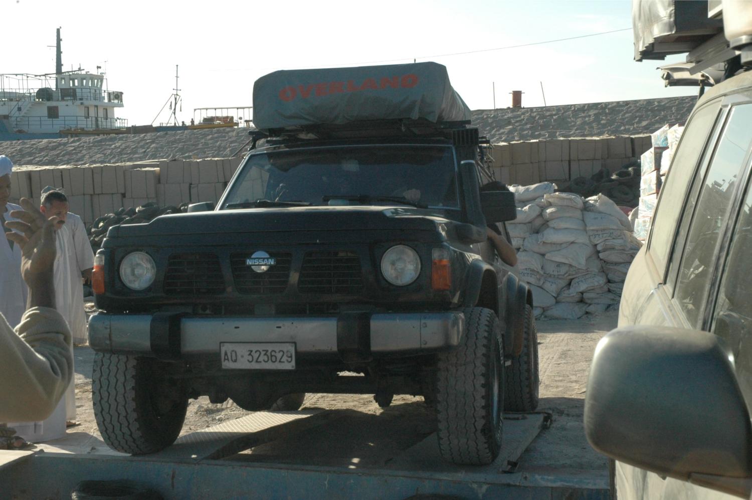 Da meldet sich ein Mahzmet, ein grauhaariger Sudanese mit fröhlichen Augen: Im Hafen liegt eine Barke, die einen Querträger hat, auf den zwei Fahrzeuge passen könnten. Sie wird in den kommenden Tagen beladen und läuft dann nach Wadi Halfa aus. Wann kann er aber nicht genau sagen. Aber das könnte klappen. Müsste aber schnell gehen, denn in 30 Minuten macht der Zoll zu, und wir müssen die Fahrzeuge drauf haben, bevor am nächsten Tag das Passagierschiff an der einzigen zum Beladen geeigneten Stelle anlegt. Sonst bekommen wir die Fahrzeuge nicht mehr drauf.